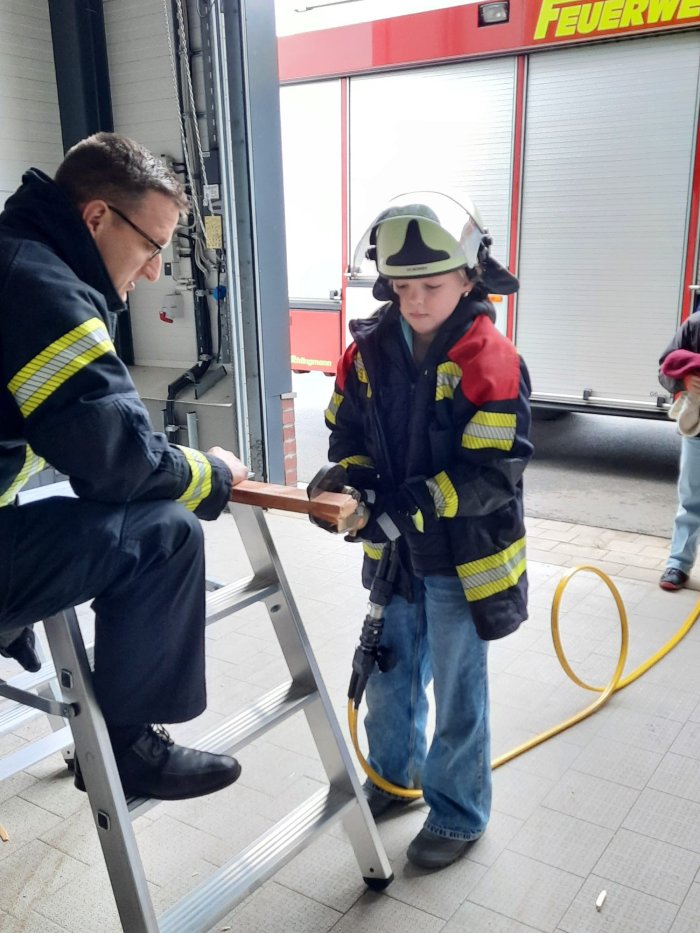 Dann durften die Kinder selber den Umgang mit einigen Gerätschaften der Feuerwehr ausprobieren. Der krönende Abschluss des Besuches war die Rückfahrt zur Schule mit verschiedenen Fahrzeugen der Feuerwehr.