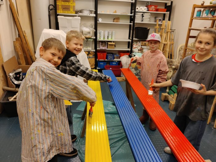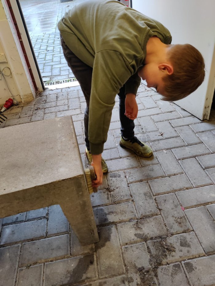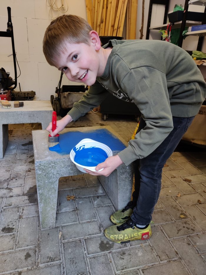 Im März kümmerte sich unsere SV um die Gestaltung einer "Freundesbank". Zerst mussten die Betonfüße mit einer Bürste vom Sand befreit werden. Zeitgleich wurden im Werkraum die Bretter für die spätere Sitzfläche vorbereitet. Alle Teile wurden in den Farben unserer Schule angemalt und gestrichen, nämlich blau, rot und gelb.