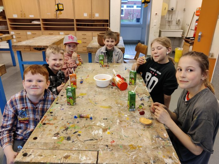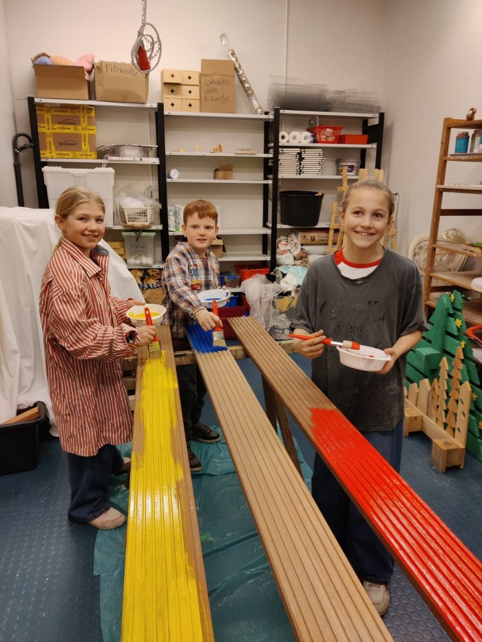 Zwischendurch gab es auch eine kleine Stärkung. Unser Hausmeister Berthold hat die farbig vorbereiteten Teile anschließend zu unserer neuen "Freundesbank" zusammengebaut. Dafür sagen wir ganz herzlich Danke!!